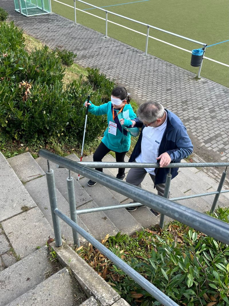 Eine große Herausforderung war für die Kinder der Rollstuhl- und Blindenparcours, bei dem entweder blind eine Treppe hoch und runter gelaufen werden konnte oder mit dem Rollstuhl ein Parcours überwunden werden musste. Der Parcours, welcher vom VDK Oberursel und der Gemeinnützigen Gesellschaft zur Förderung des Inklusiven Sports mbH zur Verfügung gestellt und begleitet wurde, war für viele Kinder nicht einfach zu überwinden. Für die teilnehmenden Kinder ohne Beeinträchtigung war es an einigen Stellen eine neue Erkenntnis, wie schwer es ist, einen Rollstuhl zu lenken oder mit diesem ein Hindernis zu überwinden.